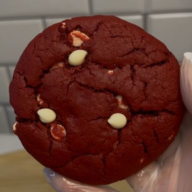 Soft and chewy Red Velvet cookies with vegan white choco chips!